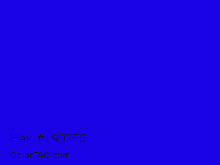 Hex #1902e6 Color is a normal indigo color and the nearest color is Bluebonnet #1c1cf0. Hex code #1902e6 and RGB value is rgb(25,2,230). In RGB color space, this color is composed of 10% red, 1% green, 90% blue, In CMYK color space, this color is composed of 89% cyan, 99% magenta, 0% yellow , 10% black , In HSL color space, this color has a hue angle of 246° , 98% saturation and 45% lightness.
