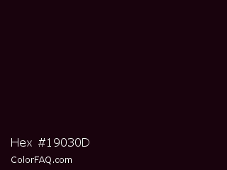 Hex #19030d Color is a almost black rose color and the nearest color is Asphalt #130a06. Hex code #19030d and RGB value is rgb(25,3,13). In RGB color space, this color is composed of 10% red, 1% green, 5% blue, In CMYK color space, this color is composed of 0% cyan, 88% magenta, 48% yellow , 90% black , In HSL color space, this color has a hue angle of 333° , 79% saturation and 5% lightness.