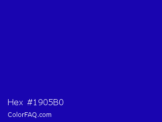 Hex #1905b0 Color is a normal indigo color and the nearest color is Zaffre #0014a8. Hex code #1905b0 and RGB value is rgb(25,5,176). In RGB color space, this color is composed of 10% red, 2% green, 69% blue, In CMYK color space, this color is composed of 86% cyan, 97% magenta, 0% yellow , 31% black , In HSL color space, this color has a hue angle of 247° , 94% saturation and 35% lightness.