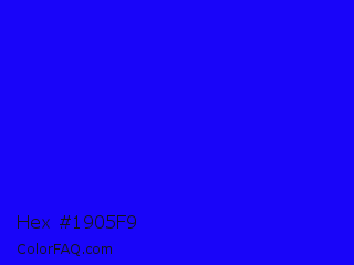 Hex #1905f9 Color is a normal indigo color and the nearest color is Bluebonnet #1c1cf0. Hex code #1905f9 and RGB value is rgb(25,5,249). In RGB color space, this color is composed of 10% red, 2% green, 98% blue, In CMYK color space, this color is composed of 90% cyan, 98% magenta, 0% yellow , 2% black , In HSL color space, this color has a hue angle of 245° , 96% saturation and 50% lightness.