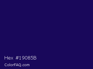 Hex #19085b Color is a very dark indigo color and the nearest color is Violent Violet #290c5e. Hex code #19085b and RGB value is rgb(25,8,91). In RGB color space, this color is composed of 10% red, 3% green, 36% blue, In CMYK color space, this color is composed of 73% cyan, 91% magenta, 0% yellow , 64% black , In HSL color space, this color has a hue angle of 252° , 84% saturation and 19% lightness.