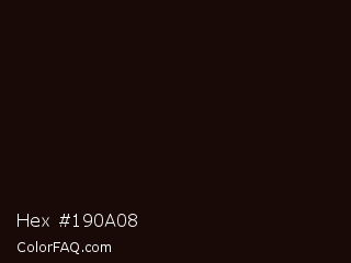 Hex #190a08 Color is a almost black red color and the nearest color is Asphalt #130a06. Hex code #190a08 and RGB value is rgb(25,10,8). In RGB color space, this color is composed of 10% red, 4% green, 3% blue, In CMYK color space, this color is composed of 0% cyan, 60% magenta, 68% yellow , 90% black , In HSL color space, this color has a hue angle of 7° , 52% saturation and 6% lightness.