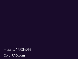 Hex #190b2b Color is a very dark violet color and the nearest color is Haiti #1b1035. Hex code #190b2b and RGB value is rgb(25,11,43). In RGB color space, this color is composed of 10% red, 4% green, 17% blue, In CMYK color space, this color is composed of 42% cyan, 74% magenta, 0% yellow , 83% black , In HSL color space, this color has a hue angle of 266° , 59% saturation and 11% lightness.