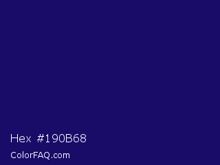 Hex #190b68 Color is a dark indigo color and the nearest color is Arapawa #110c6c. Hex code #190b68 and RGB value is rgb(25,11,104). In RGB color space, this color is composed of 10% red, 4% green, 41% blue, In CMYK color space, this color is composed of 76% cyan, 89% magenta, 0% yellow , 59% black , In HSL color space, this color has a hue angle of 249° , 81% saturation and 23% lightness.