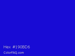 Hex #190bd6 Color is a normal indigo color and the nearest color is Medium Blue #0000cd. Hex code #190bd6 and RGB value is rgb(25,11,214). In RGB color space, this color is composed of 10% red, 4% green, 84% blue, In CMYK color space, this color is composed of 88% cyan, 95% magenta, 0% yellow , 16% black , In HSL color space, this color has a hue angle of 244° , 90% saturation and 44% lightness.