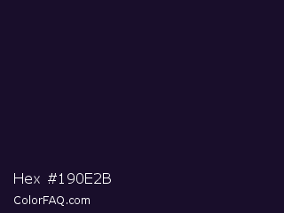 Hex #190e2b Color is a very dark violet color and the nearest color is Haiti #1b1035. Hex code #190e2b and RGB value is rgb(25,14,43). In RGB color space, this color is composed of 10% red, 5% green, 17% blue, In CMYK color space, this color is composed of 42% cyan, 67% magenta, 0% yellow , 83% black , In HSL color space, this color has a hue angle of 263° , 51% saturation and 11% lightness.