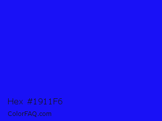Hex #1911f6 Color is a normal indigo color and the nearest color is Bluebonnet #1c1cf0. Hex code #1911f6 and RGB value is rgb(25,17,246). In RGB color space, this color is composed of 10% red, 7% green, 96% blue, In CMYK color space, this color is composed of 90% cyan, 93% magenta, 0% yellow , 4% black , In HSL color space, this color has a hue angle of 242° , 93% saturation and 52% lightness.