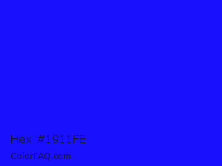 Hex #1911fe Color is a normal indigo color and the nearest color is Bluebonnet #1c1cf0. Hex code #1911fe and RGB value is rgb(25,17,254). In RGB color space, this color is composed of 10% red, 7% green, 100% blue, In CMYK color space, this color is composed of 90% cyan, 93% magenta, 0% yellow , 0% black , In HSL color space, this color has a hue angle of 242° , 99% saturation and 53% lightness.