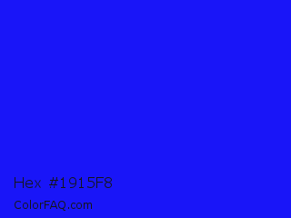 Hex #1915f8 Color is a normal indigo color and the nearest color is Bluebonnet #1c1cf0. Hex code #1915f8 and RGB value is rgb(25,21,248). In RGB color space, this color is composed of 10% red, 8% green, 97% blue, In CMYK color space, this color is composed of 90% cyan, 92% magenta, 0% yellow , 3% black , In HSL color space, this color has a hue angle of 241° , 94% saturation and 53% lightness.