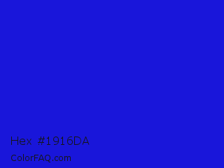 Hex #1916da Color is a normal indigo color and the nearest color is Bluebonnet #1c1cf0. Hex code #1916da and RGB value is rgb(25,22,218). In RGB color space, this color is composed of 10% red, 9% green, 85% blue, In CMYK color space, this color is composed of 89% cyan, 90% magenta, 0% yellow , 15% black , In HSL color space, this color has a hue angle of 241° , 82% saturation and 47% lightness.