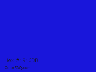 Hex #1916db Color is a normal indigo color and the nearest color is Bluebonnet #1c1cf0. Hex code #1916db and RGB value is rgb(25,22,219). In RGB color space, this color is composed of 10% red, 9% green, 86% blue, In CMYK color space, this color is composed of 89% cyan, 90% magenta, 0% yellow , 14% black , In HSL color space, this color has a hue angle of 241° , 82% saturation and 47% lightness.