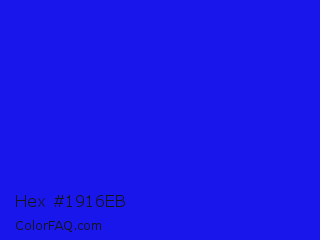 Hex #1916eb Color is a normal indigo color and the nearest color is Bluebonnet #1c1cf0. Hex code #1916eb and RGB value is rgb(25,22,235). In RGB color space, this color is composed of 10% red, 9% green, 92% blue, In CMYK color space, this color is composed of 89% cyan, 91% magenta, 0% yellow , 8% black , In HSL color space, this color has a hue angle of 241° , 84% saturation and 50% lightness.