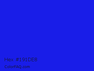 Hex #191de8 Color is a normal blue color and the nearest color is Bluebonnet #1c1cf0. Hex code #191de8 and RGB value is rgb(25,29,232). In RGB color space, this color is composed of 10% red, 11% green, 91% blue, In CMYK color space, this color is composed of 89% cyan, 88% magenta, 0% yellow , 9% black , In HSL color space, this color has a hue angle of 239° , 82% saturation and 50% lightness.