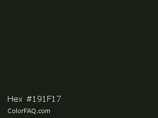 Hex #191f17 Color is a very dark green color and the nearest color is Rangoon Green #1c1e13. Hex code #191f17 and RGB value is rgb(25,31,23). In RGB color space, this color is composed of 10% red, 12% green, 9% blue, In CMYK color space, this color is composed of 19% cyan, 0% magenta, 26% yellow , 88% black , In HSL color space, this color has a hue angle of 105° , 15% saturation and 11% lightness.
