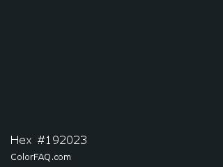 Hex #192023 Color is a very dark blue color and the nearest color is Dark Jungle Green #1a2421. Hex code #192023 and RGB value is rgb(25,32,35). In RGB color space, this color is composed of 10% red, 13% green, 14% blue, In CMYK color space, this color is composed of 29% cyan, 9% magenta, 0% yellow , 86% black , In HSL color space, this color has a hue angle of 198° , 17% saturation and 12% lightness.
