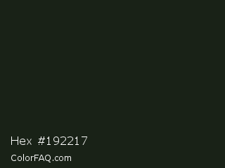 Hex #192217 Color is a very dark green color and the nearest color is Rangoon Green #1c1e13. Hex code #192217 and RGB value is rgb(25,34,23). In RGB color space, this color is composed of 10% red, 13% green, 9% blue, In CMYK color space, this color is composed of 26% cyan, 0% magenta, 32% yellow , 87% black , In HSL color space, this color has a hue angle of 109° , 19% saturation and 11% lightness.