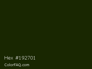 Hex #192701 Color is a almost black green color and the nearest color is Pine Tree #171f04. Hex code #192701 and RGB value is rgb(25,39,1). In RGB color space, this color is composed of 10% red, 15% green, 0% blue, In CMYK color space, this color is composed of 36% cyan, 0% magenta, 97% yellow , 85% black , In HSL color space, this color has a hue angle of 82° , 95% saturation and 8% lightness.