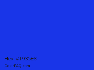 Hex #1935e8 Color is a normal blue color and the nearest color is Palatinate Blue #273be2. Hex code #1935e8 and RGB value is rgb(25,53,232). In RGB color space, this color is composed of 10% red, 21% green, 91% blue, In CMYK color space, this color is composed of 89% cyan, 77% magenta, 0% yellow , 9% black , In HSL color space, this color has a hue angle of 232° , 82% saturation and 50% lightness.