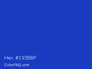Hex #193bbf Color is a normal blue color and the nearest color is Persian Blue #1c39bb. Hex code #193bbf and RGB value is rgb(25,59,191). In RGB color space, this color is composed of 10% red, 23% green, 75% blue, In CMYK color space, this color is composed of 87% cyan, 69% magenta, 0% yellow , 25% black , In HSL color space, this color has a hue angle of 228° , 77% saturation and 42% lightness.