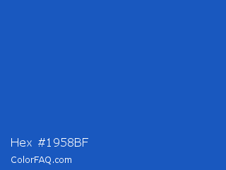 Hex #1958bf Color is a normal blue color and the nearest color is Denim #1560bd. Hex code #1958bf and RGB value is rgb(25,88,191). In RGB color space, this color is composed of 10% red, 35% green, 75% blue, In CMYK color space, this color is composed of 87% cyan, 54% magenta, 0% yellow , 25% black , In HSL color space, this color has a hue angle of 217° , 77% saturation and 42% lightness.