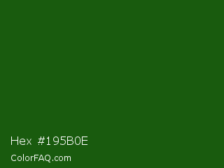 Hex #195b0e Color is a very dark green color and the nearest color is Lincoln Green #195905. Hex code #195b0e and RGB value is rgb(25,91,14). In RGB color space, this color is composed of 10% red, 36% green, 5% blue, In CMYK color space, this color is composed of 73% cyan, 0% magenta, 85% yellow , 64% black , In HSL color space, this color has a hue angle of 111° , 73% saturation and 21% lightness.
