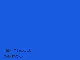 Hex #195be0 Color is a normal blue color and the nearest color is Mariner #286acd. Hex code #195be0 and RGB value is rgb(25,91,224). In RGB color space, this color is composed of 10% red, 36% green, 88% blue, In CMYK color space, this color is composed of 89% cyan, 59% magenta, 0% yellow , 12% black , In HSL color space, this color has a hue angle of 220° , 80% saturation and 49% lightness.