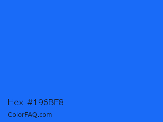 Hex #196bf8 Color is a normal blue color and the nearest color is Blue Crayola #1f75fe. Hex code #196bf8 and RGB value is rgb(25,107,248). In RGB color space, this color is composed of 10% red, 42% green, 97% blue, In CMYK color space, this color is composed of 90% cyan, 57% magenta, 0% yellow , 3% black , In HSL color space, this color has a hue angle of 218° , 94% saturation and 54% lightness.