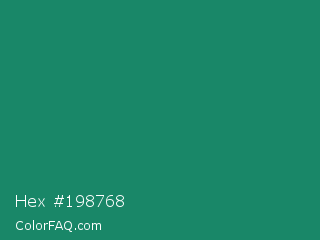 Hex #198768 Color is a normal green color and the nearest color is Deep Green Cyan Turquoise #0e7c61. Hex code #198768 and RGB value is rgb(25,135,104). In RGB color space, this color is composed of 10% red, 53% green, 41% blue, In CMYK color space, this color is composed of 81% cyan, 0% magenta, 23% yellow , 47% black , In HSL color space, this color has a hue angle of 163° , 69% saturation and 31% lightness.