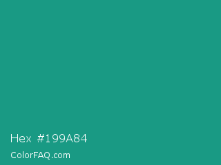 Hex #199a84 Color is a normal cyan color and the nearest color is Gossamer #069b81. Hex code #199a84 and RGB value is rgb(25,154,132). In RGB color space, this color is composed of 10% red, 60% green, 52% blue, In CMYK color space, this color is composed of 84% cyan, 0% magenta, 14% yellow , 40% black , In HSL color space, this color has a hue angle of 170° , 72% saturation and 35% lightness.