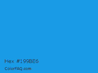 Hex #199be6 Color is a normal blue color and the nearest color is Button Blue #24a0ed. Hex code #199be6 and RGB value is rgb(25,155,230). In RGB color space, this color is composed of 10% red, 61% green, 90% blue, In CMYK color space, this color is composed of 89% cyan, 33% magenta, 0% yellow , 10% black , In HSL color space, this color has a hue angle of 202° , 80% saturation and 50% lightness.