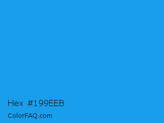 Hex #199eeb Color is a normal blue color and the nearest color is Button Blue #24a0ed. Hex code #199eeb and RGB value is rgb(25,158,235). In RGB color space, this color is composed of 10% red, 62% green, 92% blue, In CMYK color space, this color is composed of 89% cyan, 33% magenta, 0% yellow , 8% black , In HSL color space, this color has a hue angle of 202° , 84% saturation and 51% lightness.