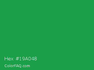 Hex #19a048 Color is a normal green color and the nearest color is Green Pigment #00a550. Hex code #19a048 and RGB value is rgb(25,160,72). In RGB color space, this color is composed of 10% red, 63% green, 28% blue, In CMYK color space, this color is composed of 84% cyan, 0% magenta, 55% yellow , 37% black , In HSL color space, this color has a hue angle of 141° , 73% saturation and 36% lightness.
