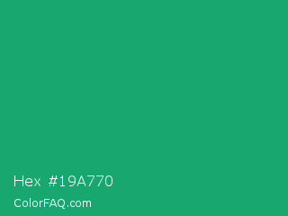 Hex #19a770 Color is a normal green color and the nearest color is Green Crayola #1cac78. Hex code #19a770 and RGB value is rgb(25,167,112). In RGB color space, this color is composed of 10% red, 65% green, 44% blue, In CMYK color space, this color is composed of 85% cyan, 0% magenta, 33% yellow , 35% black , In HSL color space, this color has a hue angle of 157° , 74% saturation and 38% lightness.