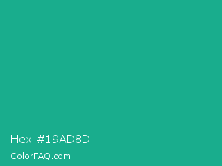 Hex #19ad8d Color is a normal cyan color and the nearest color is Mountain Meadow Crayola #1ab385. Hex code #19ad8d and RGB value is rgb(25,173,141). In RGB color space, this color is composed of 10% red, 68% green, 55% blue, In CMYK color space, this color is composed of 86% cyan, 0% magenta, 18% yellow , 32% black , In HSL color space, this color has a hue angle of 167° , 75% saturation and 39% lightness.