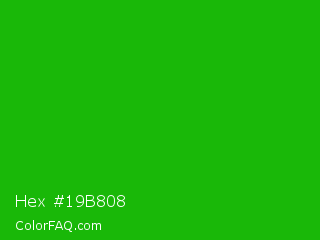 Hex #19b808 Color is a normal green color and the nearest color is Slimy Green #299617. Hex code #19b808 and RGB value is rgb(25,184,8). In RGB color space, this color is composed of 10% red, 72% green, 3% blue, In CMYK color space, this color is composed of 86% cyan, 0% magenta, 96% yellow , 28% black , In HSL color space, this color has a hue angle of 114° , 92% saturation and 38% lightness.