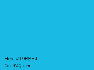 Hex #19bbe4 Color is a normal cyan color and the nearest color is Battery Charged Blue #1dacd6. Hex code #19bbe4 and RGB value is rgb(25,187,228). In RGB color space, this color is composed of 10% red, 73% green, 89% blue, In CMYK color space, this color is composed of 89% cyan, 18% magenta, 0% yellow , 11% black , In HSL color space, this color has a hue angle of 192° , 80% saturation and 50% lightness.