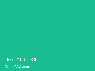 Hex #19bd8f Color is a normal green color and the nearest color is Mountain Meadow Crayola #1ab385. Hex code #19bd8f and RGB value is rgb(25,189,143). In RGB color space, this color is composed of 10% red, 74% green, 56% blue, In CMYK color space, this color is composed of 87% cyan, 0% magenta, 24% yellow , 26% black , In HSL color space, this color has a hue angle of 163° , 77% saturation and 42% lightness.