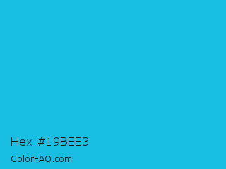 Hex #19bee3 Color is a normal cyan color and the nearest color is Battery Charged Blue #1dacd6. Hex code #19bee3 and RGB value is rgb(25,190,227). In RGB color space, this color is composed of 10% red, 75% green, 89% blue, In CMYK color space, this color is composed of 89% cyan, 16% magenta, 0% yellow , 11% black , In HSL color space, this color has a hue angle of 191° , 80% saturation and 49% lightness.