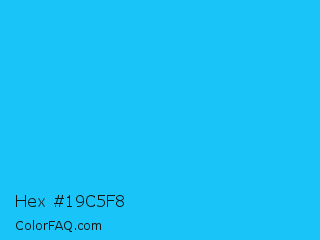 Hex #19c5f8 Color is a normal blue color and the nearest color is Spiro Disco Ball #0fc0fc. Hex code #19c5f8 and RGB value is rgb(25,197,248). In RGB color space, this color is composed of 10% red, 77% green, 97% blue, In CMYK color space, this color is composed of 90% cyan, 21% magenta, 0% yellow , 3% black , In HSL color space, this color has a hue angle of 194° , 94% saturation and 54% lightness.