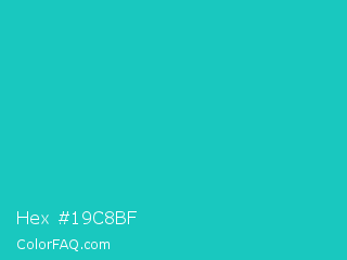 Hex #19c8bf Color is a normal cyan color and the nearest color is Java #1fc2c2. Hex code #19c8bf and RGB value is rgb(25,200,191). In RGB color space, this color is composed of 10% red, 78% green, 75% blue, In CMYK color space, this color is composed of 88% cyan, 0% magenta, 5% yellow , 22% black , In HSL color space, this color has a hue angle of 177° , 78% saturation and 44% lightness.