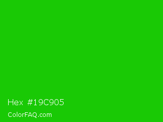 Hex #19c905 Color is a normal green color and the nearest color is Harlequin Green #46cb18. Hex code #19c905 and RGB value is rgb(25,201,5). In RGB color space, this color is composed of 10% red, 79% green, 2% blue, In CMYK color space, this color is composed of 88% cyan, 0% magenta, 98% yellow , 21% black , In HSL color space, this color has a hue angle of 114° , 95% saturation and 40% lightness.