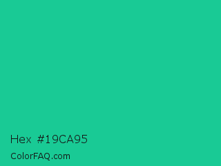Hex #19ca95 Color is a normal green color and the nearest color is Caribbean Green #00cc99. Hex code #19ca95 and RGB value is rgb(25,202,149). In RGB color space, this color is composed of 10% red, 79% green, 58% blue, In CMYK color space, this color is composed of 88% cyan, 0% magenta, 26% yellow , 21% black , In HSL color space, this color has a hue angle of 162° , 78% saturation and 45% lightness.