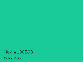 Hex #19cb98 Color is a normal green color and the nearest color is Caribbean Green #00cc99. Hex code #19cb98 and RGB value is rgb(25,203,152). In RGB color space, this color is composed of 10% red, 80% green, 60% blue, In CMYK color space, this color is composed of 88% cyan, 0% magenta, 25% yellow , 20% black , In HSL color space, this color has a hue angle of 163° , 78% saturation and 45% lightness.
