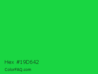 Hex #19d642 Color is a normal green color and the nearest color is Malachite #0bda51. Hex code #19d642 and RGB value is rgb(25,214,66). In RGB color space, this color is composed of 10% red, 84% green, 26% blue, In CMYK color space, this color is composed of 88% cyan, 0% magenta, 69% yellow , 16% black , In HSL color space, this color has a hue angle of 133° , 79% saturation and 47% lightness.