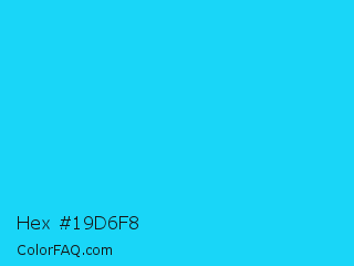 Hex #19d6f8 Color is a normal cyan color and the nearest color is Spiro Disco Ball #0fc0fc. Hex code #19d6f8 and RGB value is rgb(25,214,248). In RGB color space, this color is composed of 10% red, 84% green, 97% blue, In CMYK color space, this color is composed of 90% cyan, 14% magenta, 0% yellow , 3% black , In HSL color space, this color has a hue angle of 189° , 94% saturation and 54% lightness.