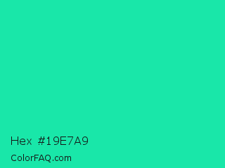 Hex #19e7a9 Color is a normal green color and the nearest color is Medium Spring Green #00fa9a. Hex code #19e7a9 and RGB value is rgb(25,231,169). In RGB color space, this color is composed of 10% red, 91% green, 66% blue, In CMYK color space, this color is composed of 89% cyan, 0% magenta, 27% yellow , 9% black , In HSL color space, this color has a hue angle of 162° , 81% saturation and 50% lightness.