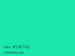Hex #19e7ad Color is a normal green color and the nearest color is Medium Spring Green #00fa9a. Hex code #19e7ad and RGB value is rgb(25,231,173). In RGB color space, this color is composed of 10% red, 91% green, 68% blue, In CMYK color space, this color is composed of 89% cyan, 0% magenta, 25% yellow , 9% black , In HSL color space, this color has a hue angle of 163° , 81% saturation and 50% lightness.