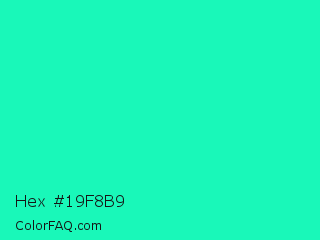 Hex #19f8b9 Color is a normal green color and the nearest color is Medium Spring Green #00fa9a. Hex code #19f8b9 and RGB value is rgb(25,248,185). In RGB color space, this color is composed of 10% red, 97% green, 73% blue, In CMYK color space, this color is composed of 90% cyan, 0% magenta, 25% yellow , 3% black , In HSL color space, this color has a hue angle of 163° , 94% saturation and 54% lightness.