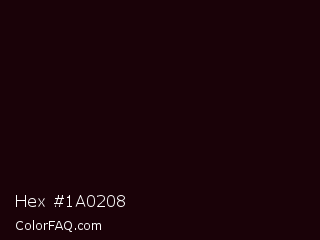Hex #1a0208 Color is a almost black red color and the nearest color is Nero #140600. Hex code #1a0208 and RGB value is rgb(26,2,8). In RGB color space, this color is composed of 10% red, 1% green, 3% blue, In CMYK color space, this color is composed of 0% cyan, 92% magenta, 69% yellow , 90% black , In HSL color space, this color has a hue angle of 345° , 86% saturation and 5% lightness.