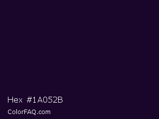 Hex #1a052b Color is a almost black purple color and the nearest color is Black Rock #0d0332. Hex code #1a052b and RGB value is rgb(26,5,43). In RGB color space, this color is composed of 10% red, 2% green, 17% blue, In CMYK color space, this color is composed of 40% cyan, 88% magenta, 0% yellow , 83% black , In HSL color space, this color has a hue angle of 273° , 79% saturation and 9% lightness.